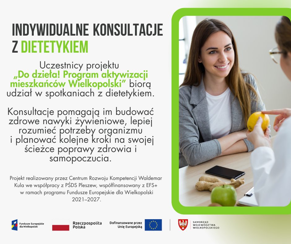 Uczestnicy projektu „Do dzieła! Program aktywizacji mieszkańców Wielkopolski” biorą udział w indywidualnych konsultacjach z dietetykiem.