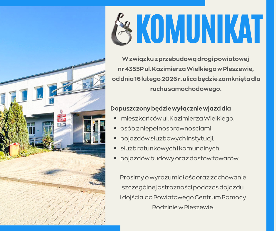 Informujemy, że w związku z planowaną przebudową drogi powiatowej nr 4355P ul. Kazimierza Wielkiego w Pleszewie, w najbliższym czasie wystąpią utrudnienia w ruchu drogowym oraz w dostępie komunikacyjnym do instytucji zlokalizowanych przy tej ulicy, w tym do Powiatowego Centrum Pomocy Rodzinie w Pleszewie.