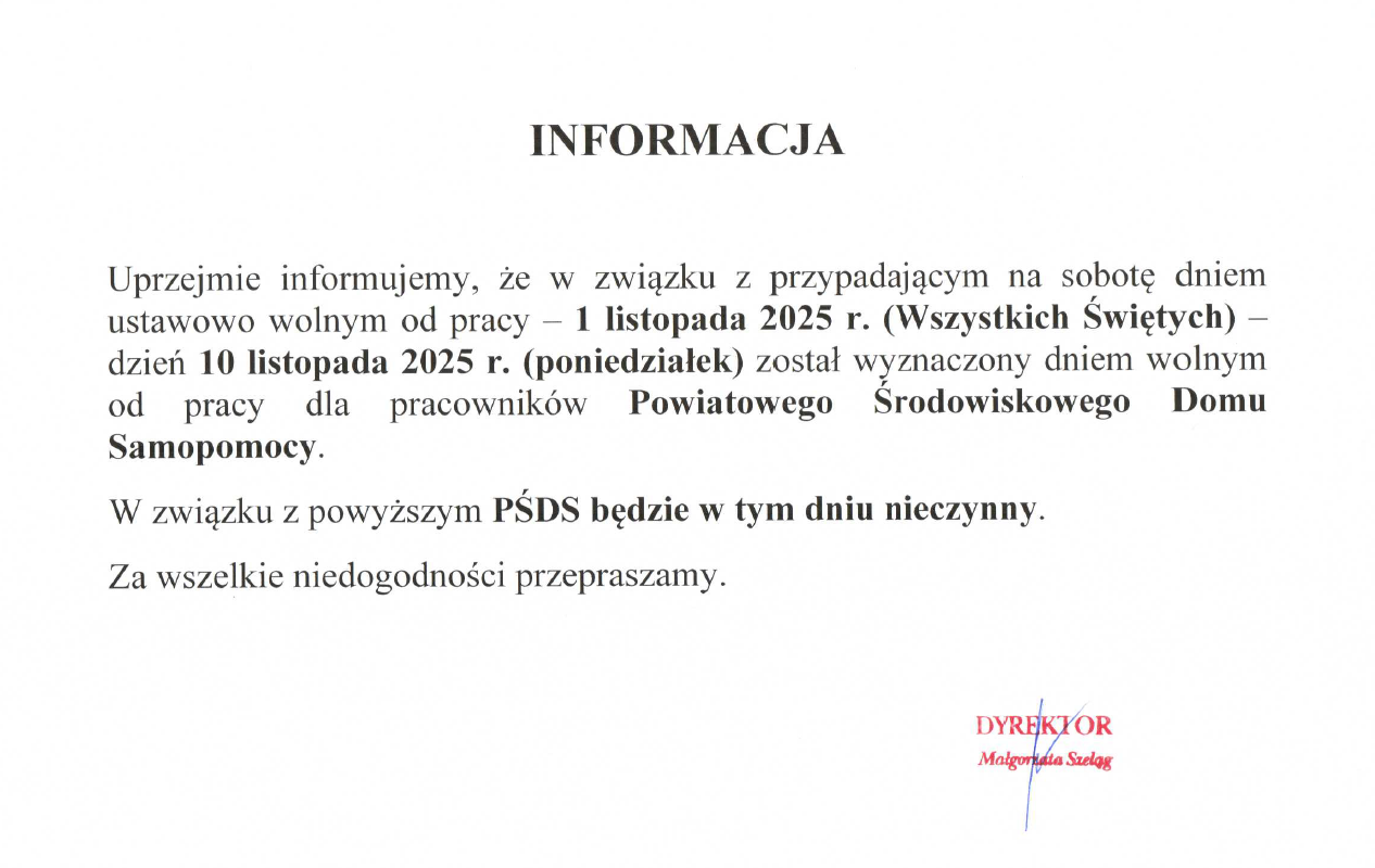 10 listopada 2025 r. PŚDS w Pleszewie nieczynne